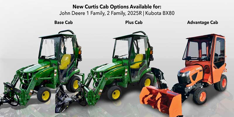 Curtis Industries released eight new tractor cab enclosure models for current model John Deere 1 Family 1023E/1025R, 2 Family 2032R/2038R, 2025R and Kubota BX-80 tractors.