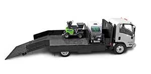The LawnScaper accommodates a 300-gallon or 400-gallon Graham spray unit, a ride-on mower or spreader-sprayer and other landscape and spray equipment on the bed of an Isuzu NPR-HD truck. The ride-on equipment sits on the truck bed, so users of the LawnScaper can avoid towing a trailer, according to the company.