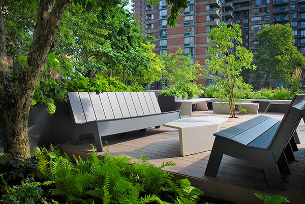 Plantings are scaled and placed in order to strike the ideal balance between privacy and views to the East River and an otherwise public corridor, used by residents of Roosevelt Island for jogging, strolling, eating lunch and access to the public transport.