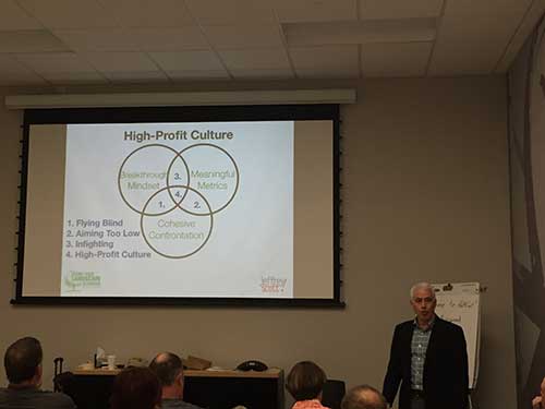The workshop centered on “Jeffrey Scott’s Proven 5 Step-Business Building Process.” The process is based on the following principles: find & motivate better people, surround them with better systems, sell to fill increased production, real time metrics to manage by and keeping yourself time efficient to ensure traction.
