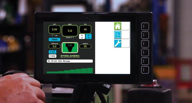 Opti-Rate is an advanced pulse width modulation (PWM) rate-controlled spray system that independently controls flow rate and pressure to maintain a consistent application across the entire boom. When a Steel Green machine turns, Opti-Rate ensures the spray rate remains consistent through turn compensation. Opti-Rate also increases output when the machine speeds up and decreases output when it slows down to maximize chemical savings. Opti-Rate is available as an optional accessory, is compatible with all new Steel Green models, and can be factory-installed on older machines.