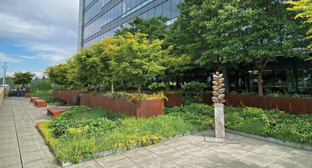 Groundcover density and variety of plant materials offer an oasis for occupants throughout the working day. Effective irrigation is key to maintenance success 100 feet from ground level.
